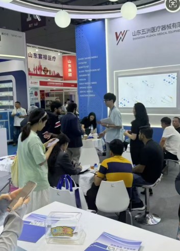 Ang Shandong Wuzhou Medical Equipment Co, Ltd ay matatagpuan sa Booth E45-48, na matatagpuan sa Hall 16. Ang disenyo ng booth ay simple at mapagbigay, na nagtatampok ng mga katangian ng tatak ng kumpanya at mga pakinabang ng produkto. Dinala ng kumpanya ang pinakabagong kagamitan sa medikal sa eksibisyon, na nagpapakita ng pinakabagong mga nagawa at advanced na teknolohiya sa larangan ng medikal na kagamitan sa mga madla mula sa buong mundo.
